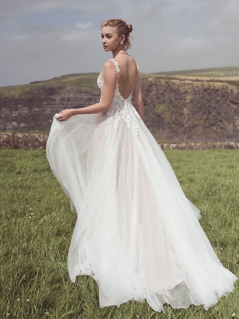 Your boho dream manifests itself in this divine floral bridal vision. An irresistible silhouette lined with Jenday stretch jersey for carefree comfort. Tank straps tailored in sheer lace lead to a plunging illusion V-neckline and sheer organza lined bodice. Uembellished lace motifs over tulle dance throughout, creating soft illusion. A deep scoop backline provides double delight and leads to a chapel length train.