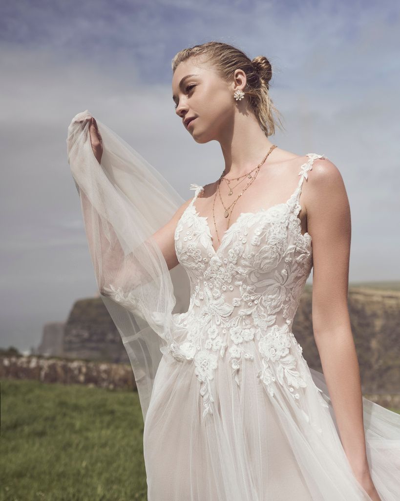 Opt for detachable beaded spaghetti straps or dreamy off-the-shoulder cap-sleeves with floral detailing and beaded lace for diffent looks throughout you day.