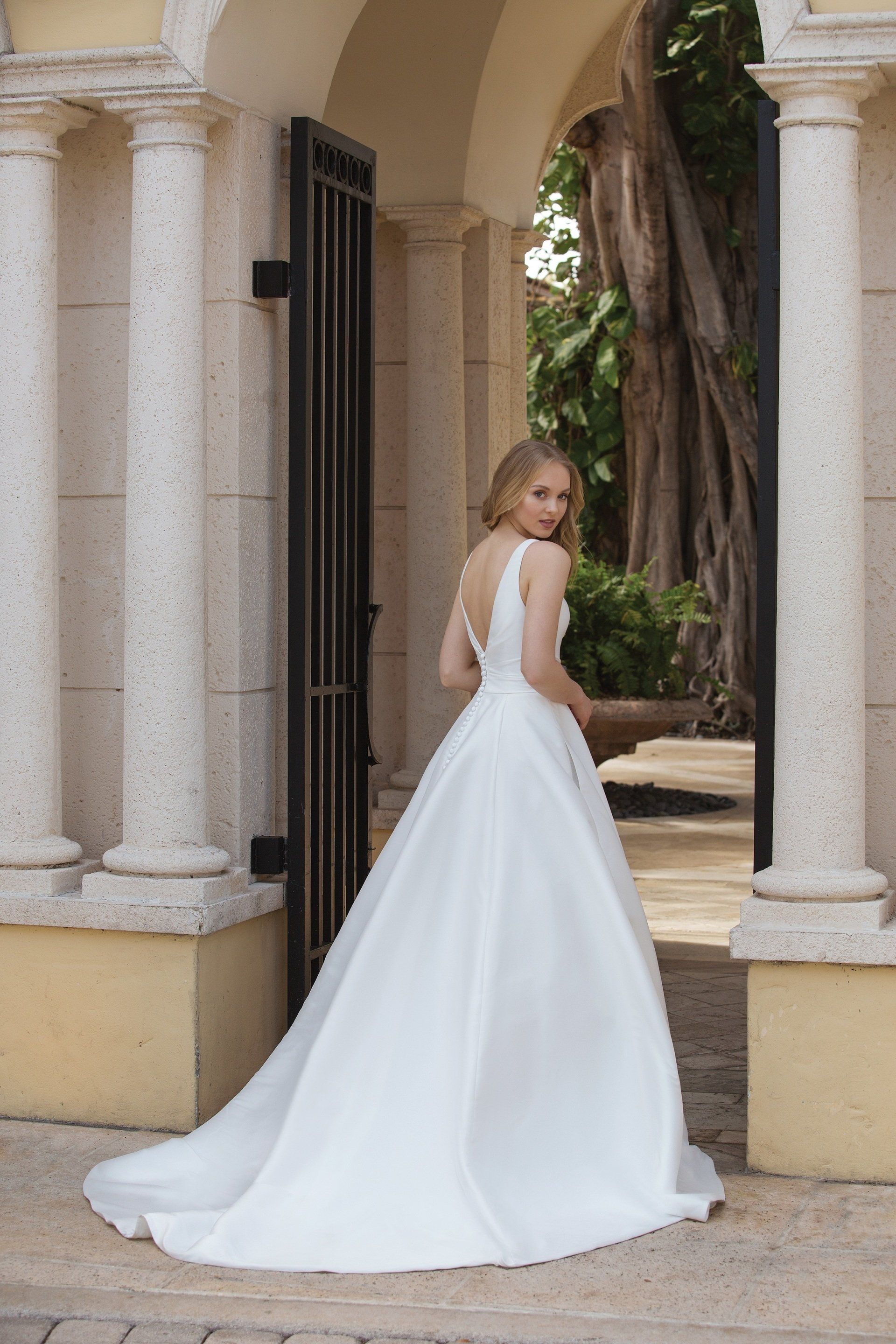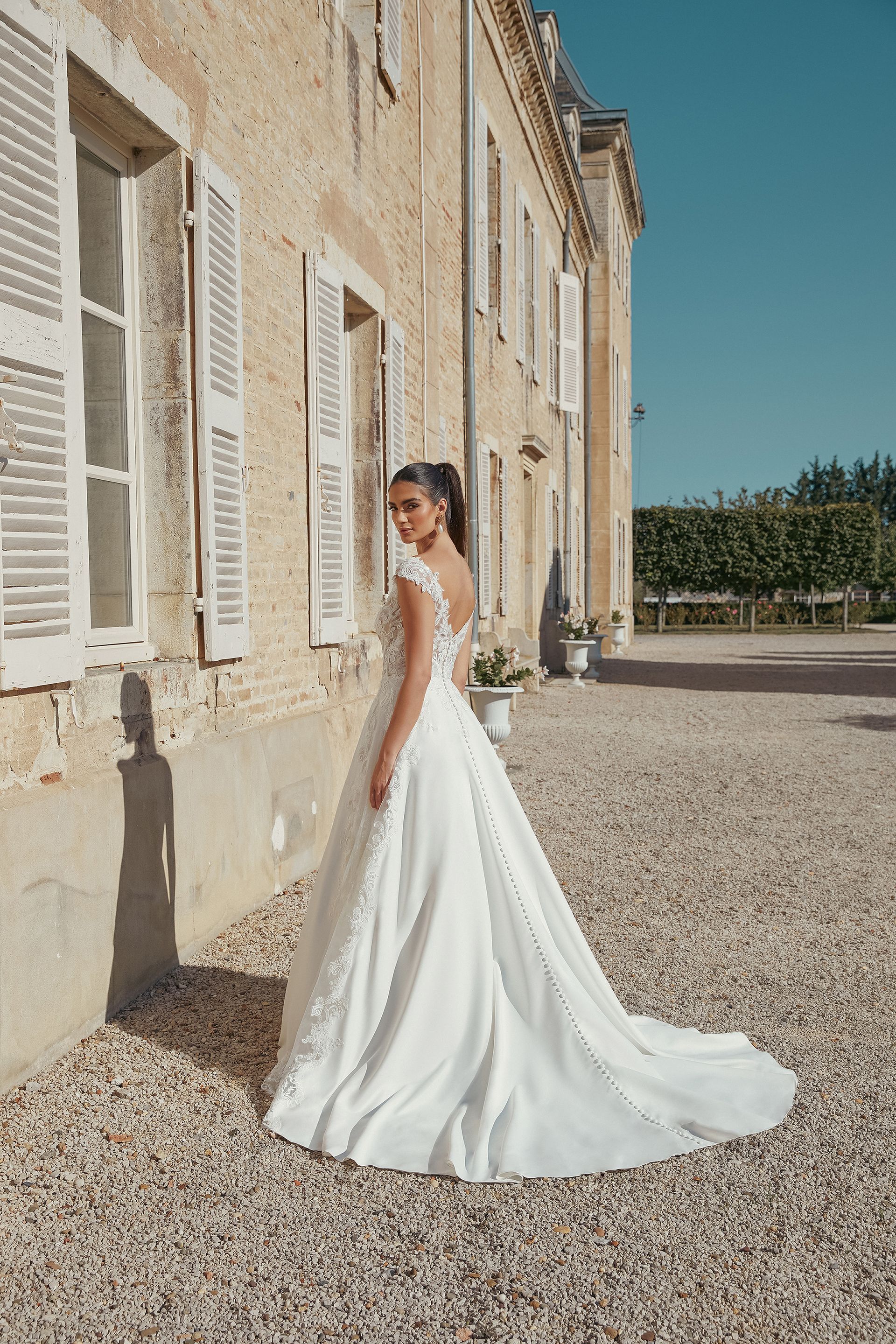 This regal stretch Mikado ball gown will have you dreaming of your magical day. The sheer bodice features a plunging V-neckline accented with cap sleeves that lead to an exquisite illusion back. Lace appliqués are hand-placed and embellished with tonal beading to create a subtle shimmer as you move. A stretch Mikado belt tacked at the natural waist leads to the timeless clean skirt detailed with pockets. Covered buttons cascading to the end of the chapel length train are the finishing touch to this classic bridal gown.