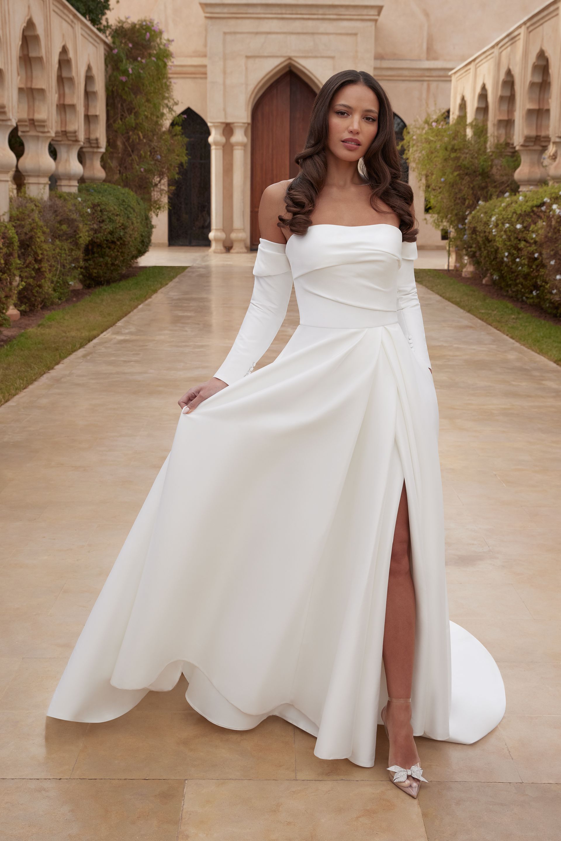 A-line gown. The draped straight strapless neckline is a flattering highlight. A graceful pleated skirt leads to a slit allowing movement that is simply enchanting. Finished with Mikado covered buttons and a chapel length train. Polish off this pure elegance with optional with off the shoulder long sleeves.