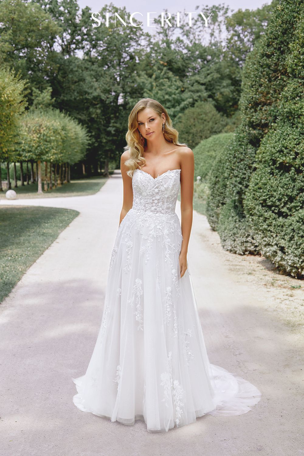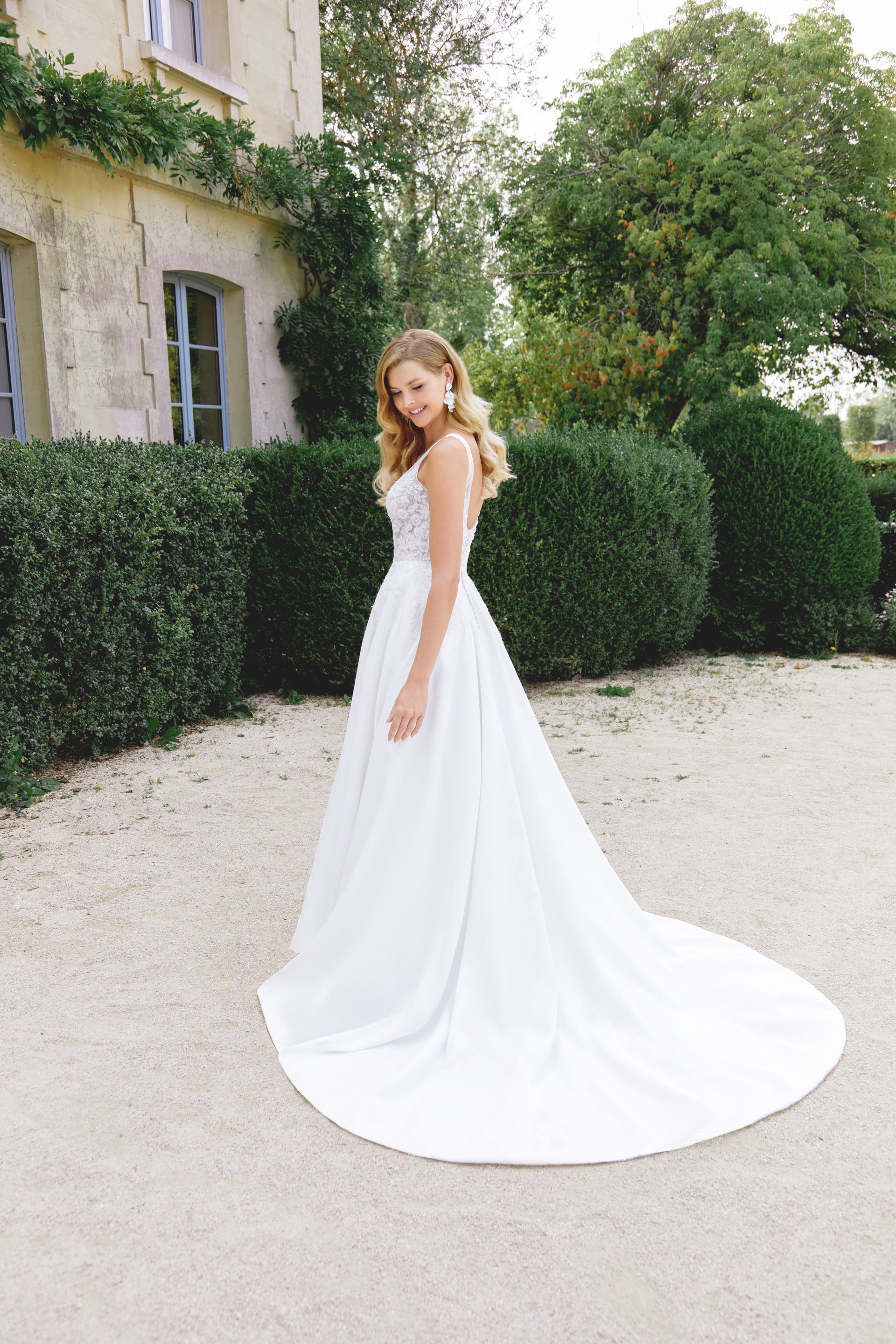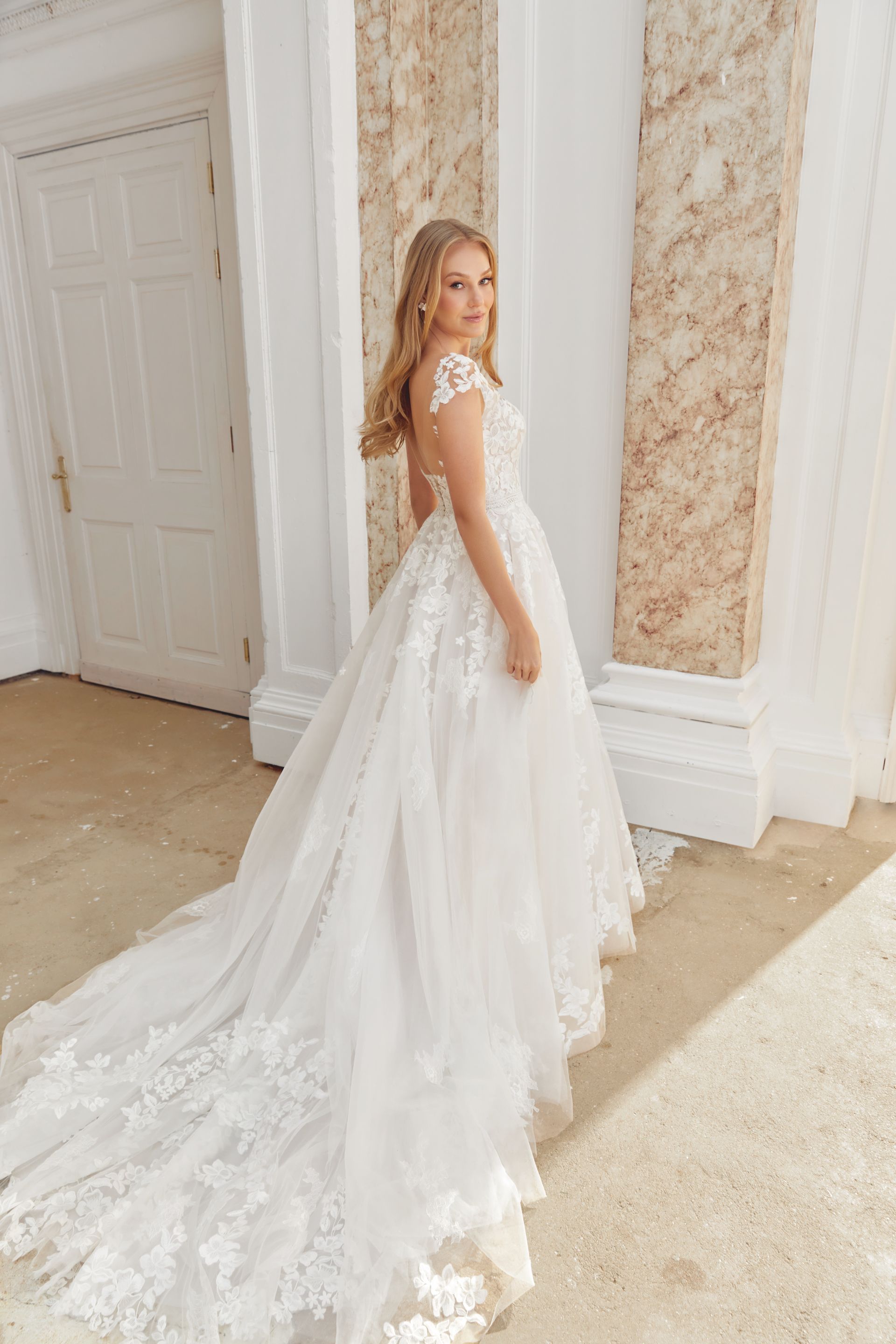 For a touch of whimsy, pair this style with an optional detachable tulle cape and for a more modest look, this style is also available with the bodice lined to the back .