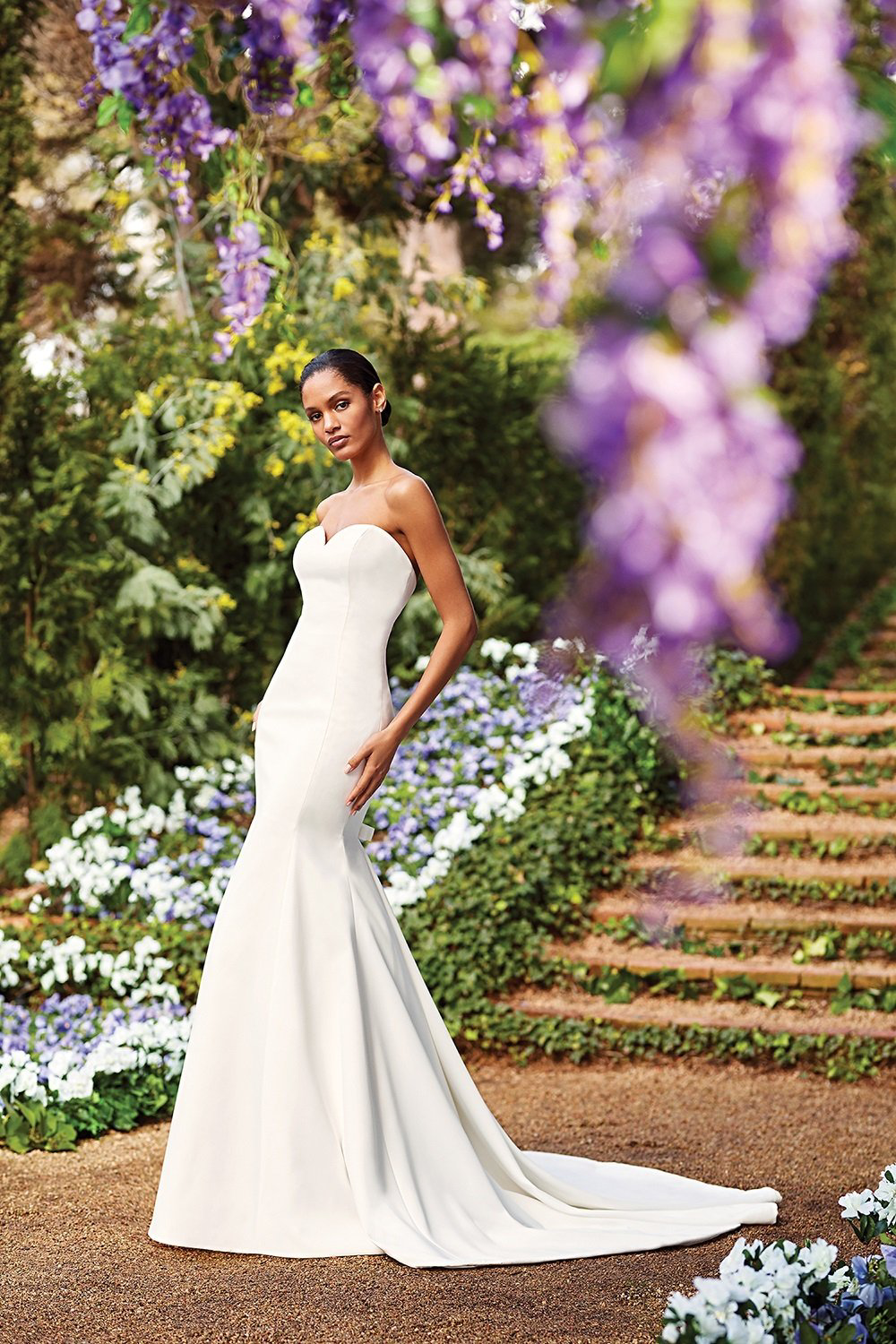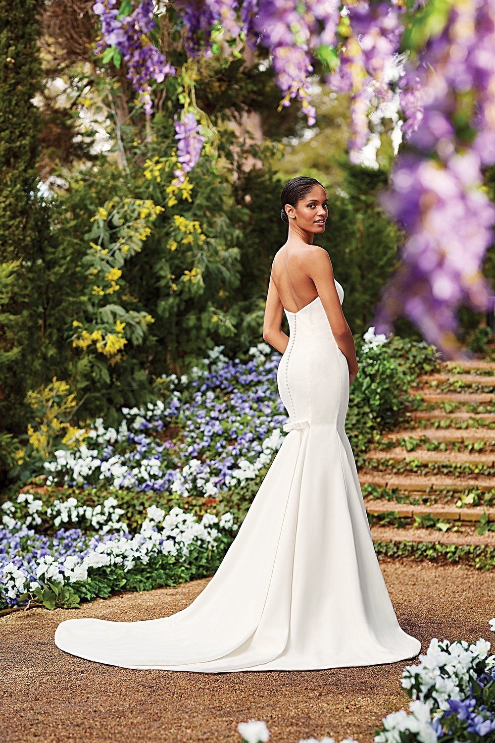 Simply chic with clean lines this strapless lavish satin fit and flare gown will enhance your curves and provide the WOW factor for your big day. Featuring a sweetheat neckine and princess seams down to the front hem. A trendy yet timeless bow on the back adds a little sass and completes this stand out gown.