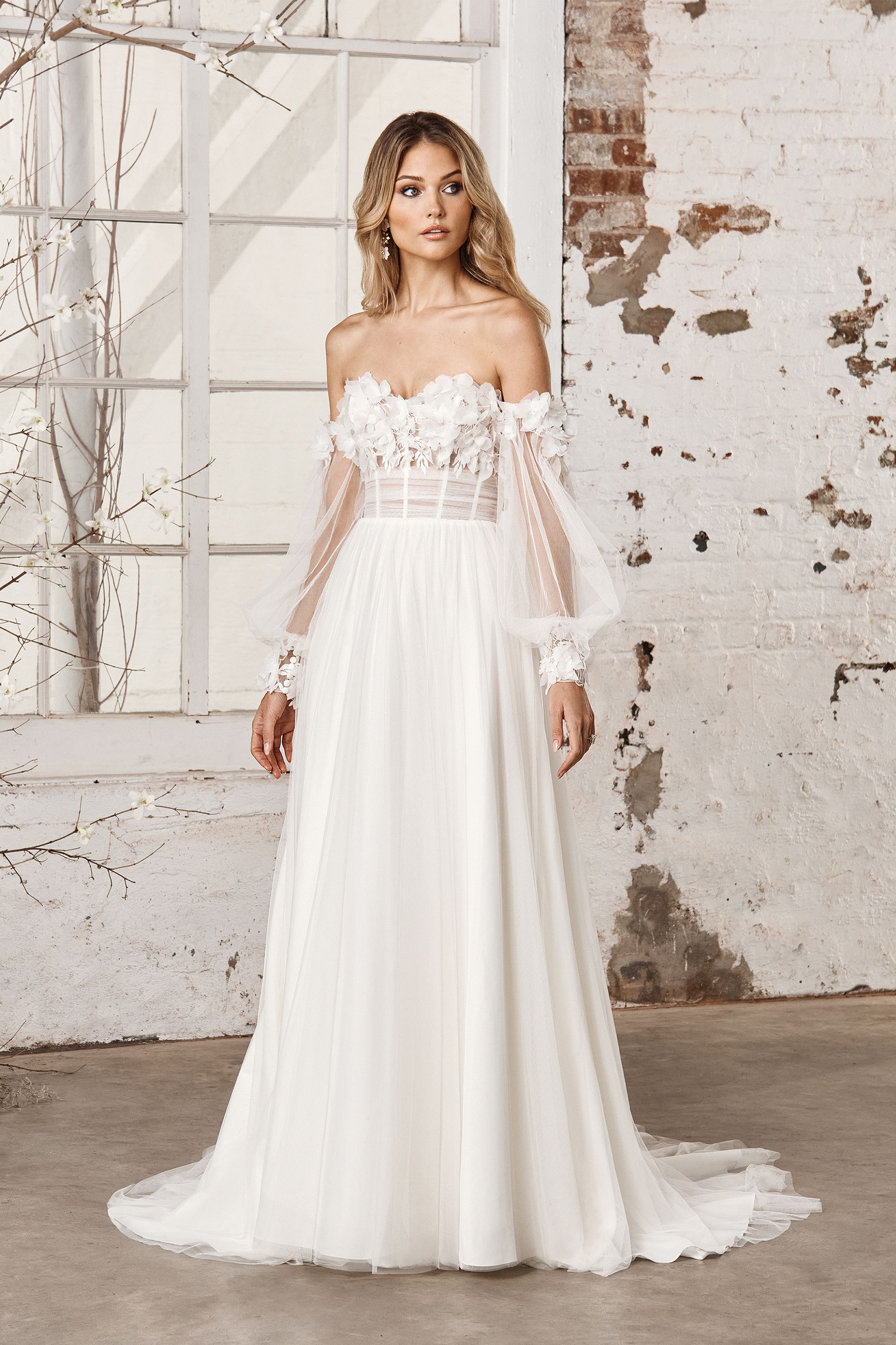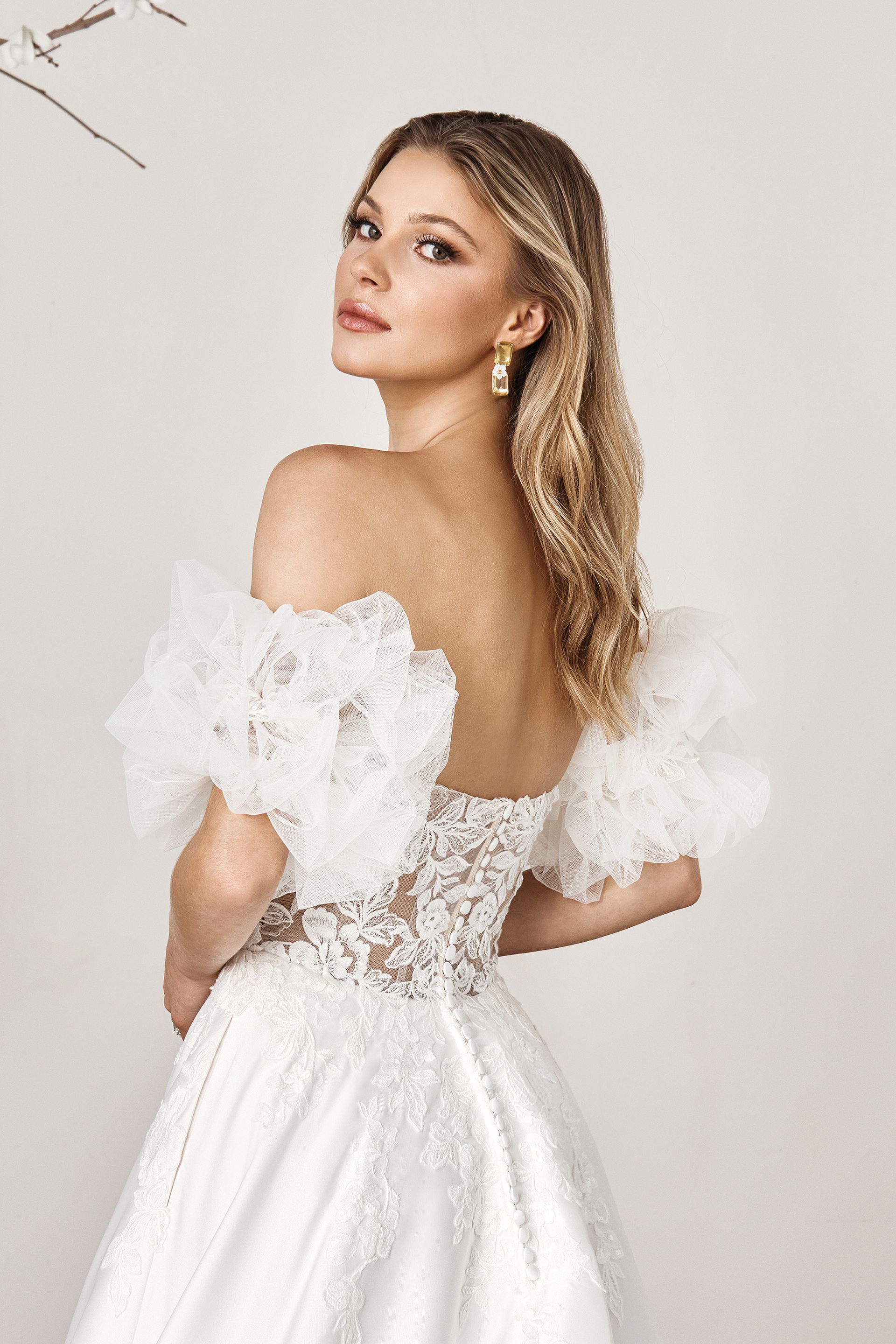 For an added touch of romance, pair with optional detachable puff sleeves.