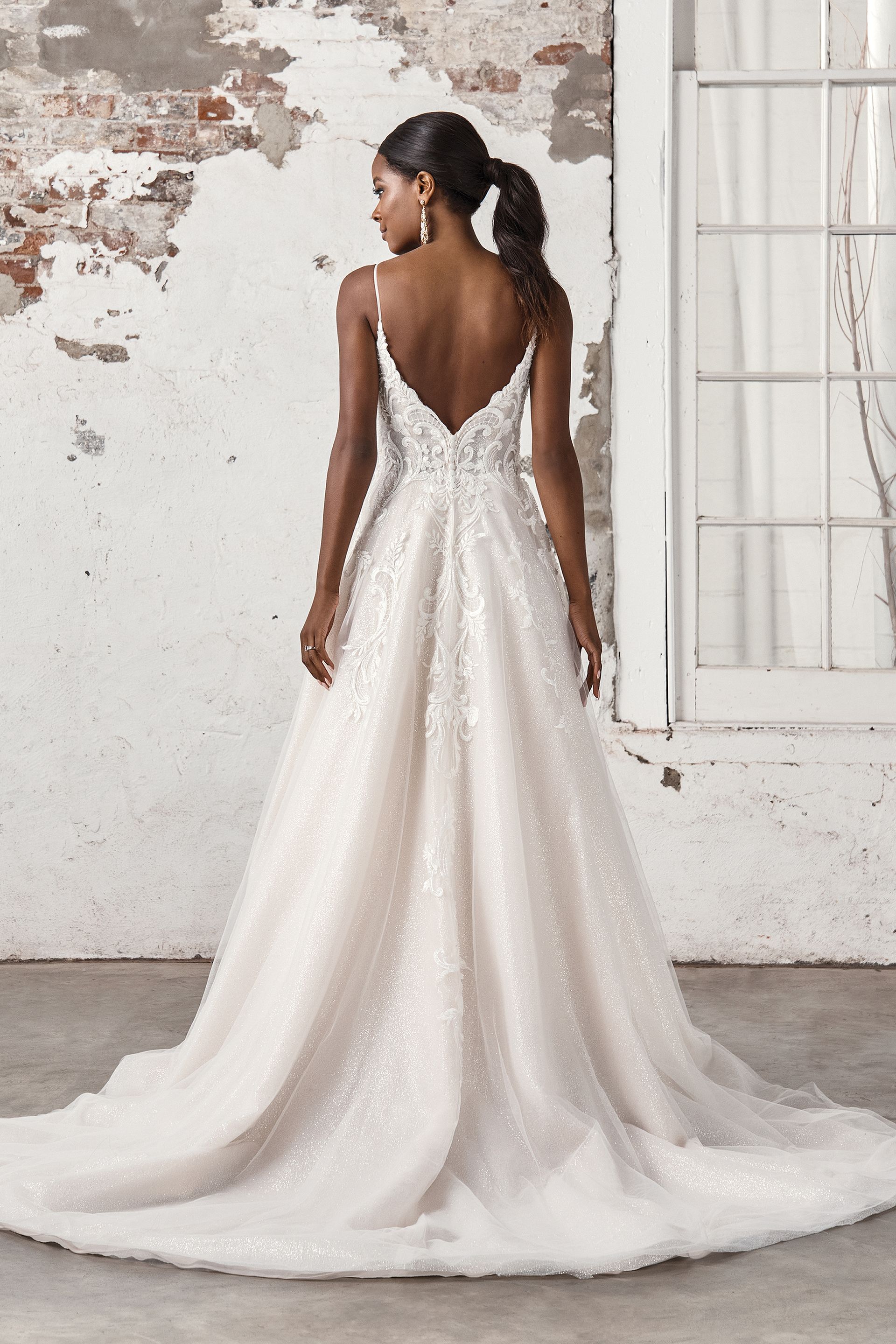 Lightweight and oh so feminine, this slim ball gown will bring your wedding vision to life. The plunging bikini neckline is detailed with wispy tulle spaghetti straps that lead to an alluring V-back. Designed with a glorious twinkling glitter tulle underlay and embellished with tonal beaded and sequined lace appliqués. A chapel length train and tulle covered buttons down the back bodice finishes this romantic gown.