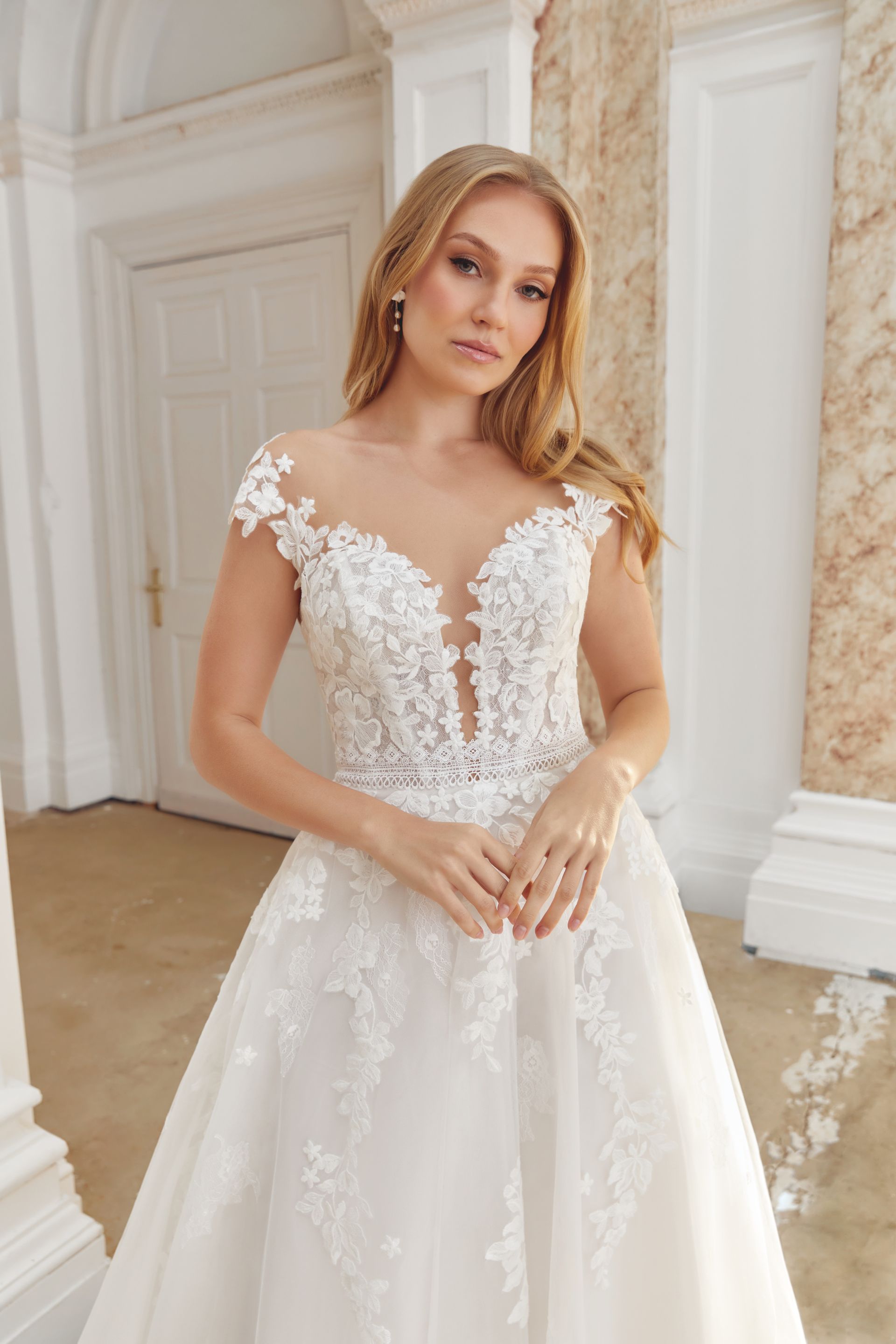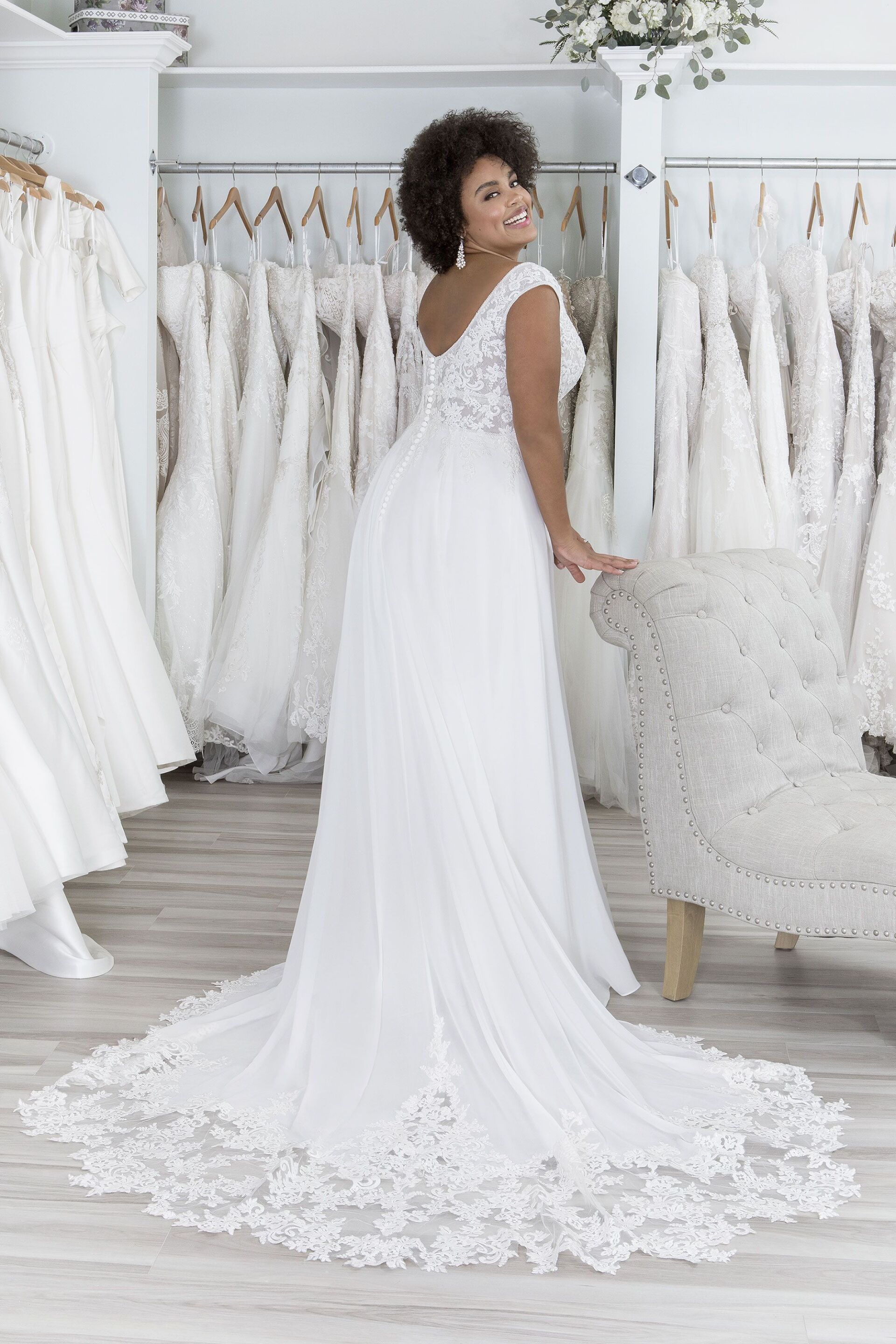 Sumptuoulsly soft, this A-line gown captures the heart, with graceful satin and dreamy lace details. A modest plunging V-neckline and V-back is cleverly balanced with ilusion textured lace cap sleeves. A sheer bodice is detailed with a Chantilly lace underlay corset running from the sweetheart plunge neckline to the back, embellished with tonal beaded and sequined lace appliques. The unique full skirt features matching godet Chantilly lace cutouts on the sides . Finished with satin covered buttons extending to the end of the sweep length train. Perfect for curves and the bride who wants to feel both romantic and unforgettable.