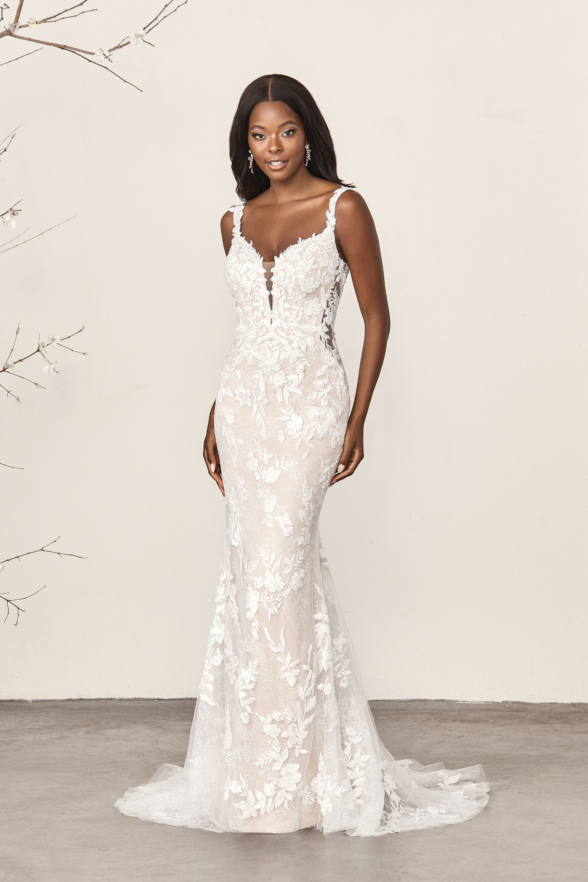 Chanel your inner Goddess in this allover lace fit and flare gown with a scoop neckline and textured detailed straps. Embroidered lace with tonal sequins and seed beads over a layer of glitter tulle add to the magic of this alluring style. A sheer bodice reveals exposed boning paired with a stunning low scoop back with sheer illusion for a sensual touch. Completed with a scalloped edged hemline and chapel length train.
