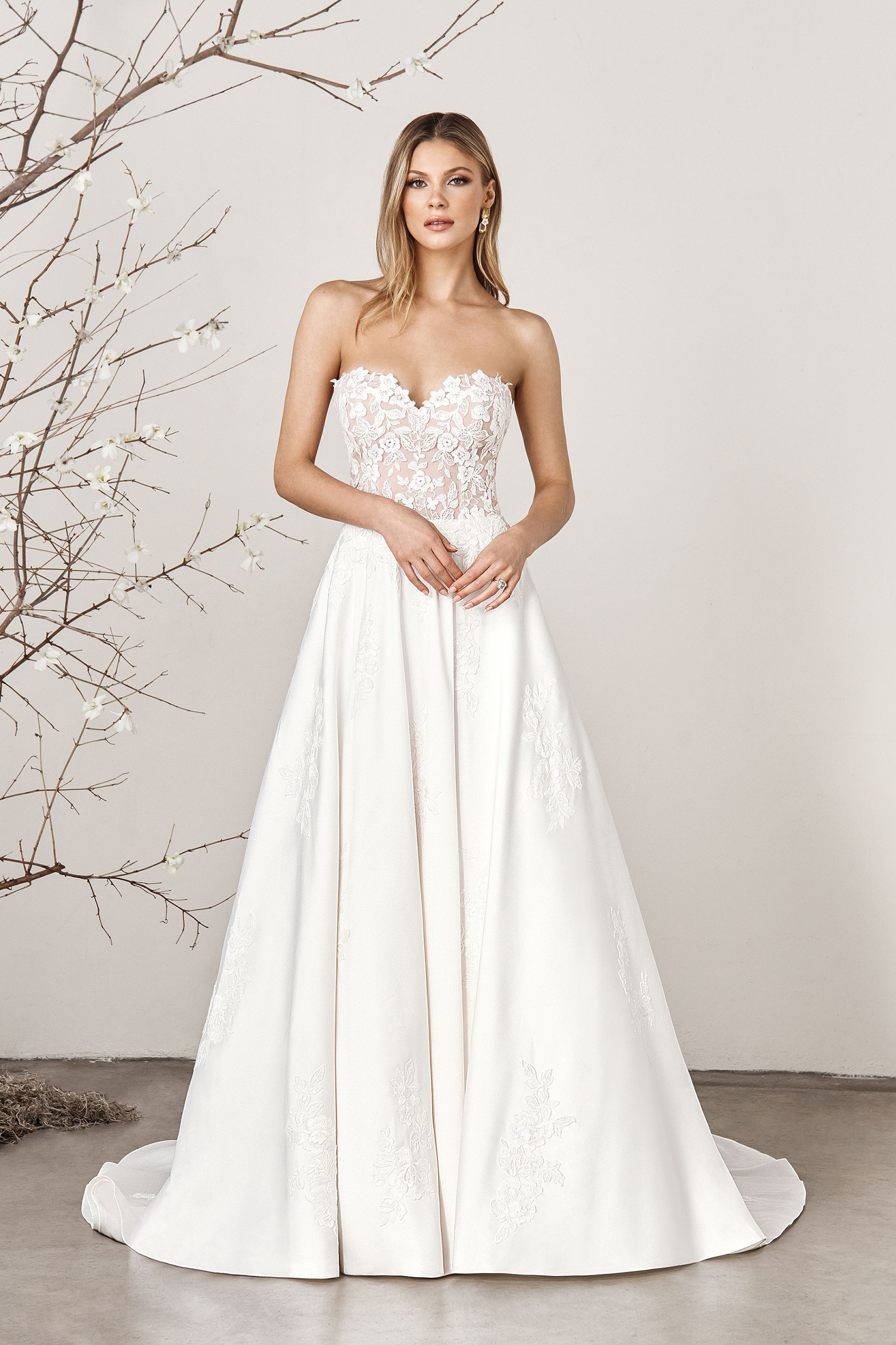 Romance lives on in this graceful strapless Mikado A-line bridal gown. The sweetheart neckline and sheer back scream classic femininity. The front bodice is lined to the side seams and adorned with sequined floral lace appliqués that float throughout the skirt. A gown impeccably finished with fun yet practical pockets., A chapel length train, and Mikado covered buttons down the back bodice ensure the perfect rear vision.