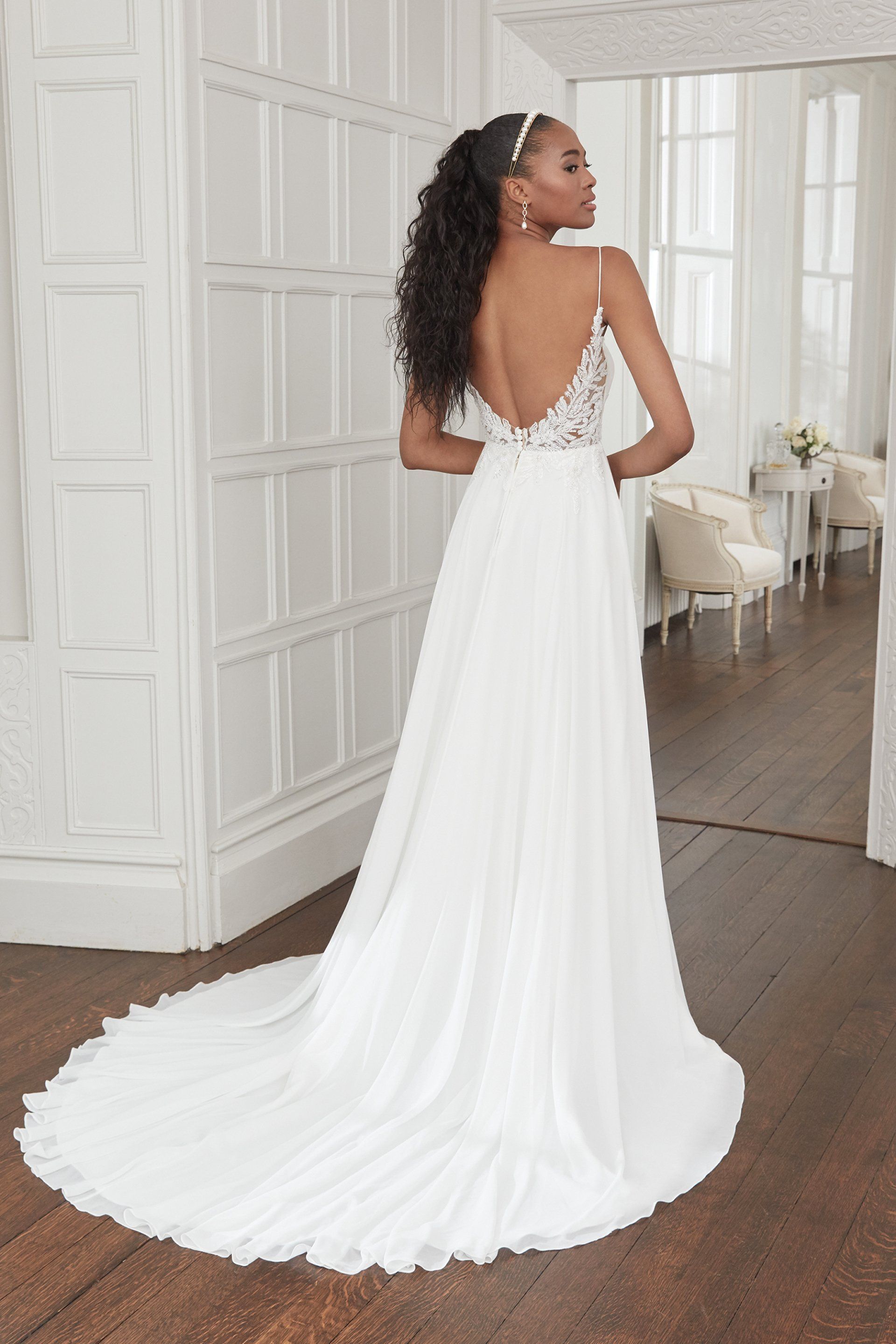 Simple and effortless, this graceful A-line bridal gown features a bikini neckline accented with dainty spaghetti straps and a figure-flattering inset waistband. Tonal beaded and sequined appliqués embellish the open V-back, catching the light for a soft glisten. A chapel length train is the finishing touch to the the romantic flowy chiffon skirt.
