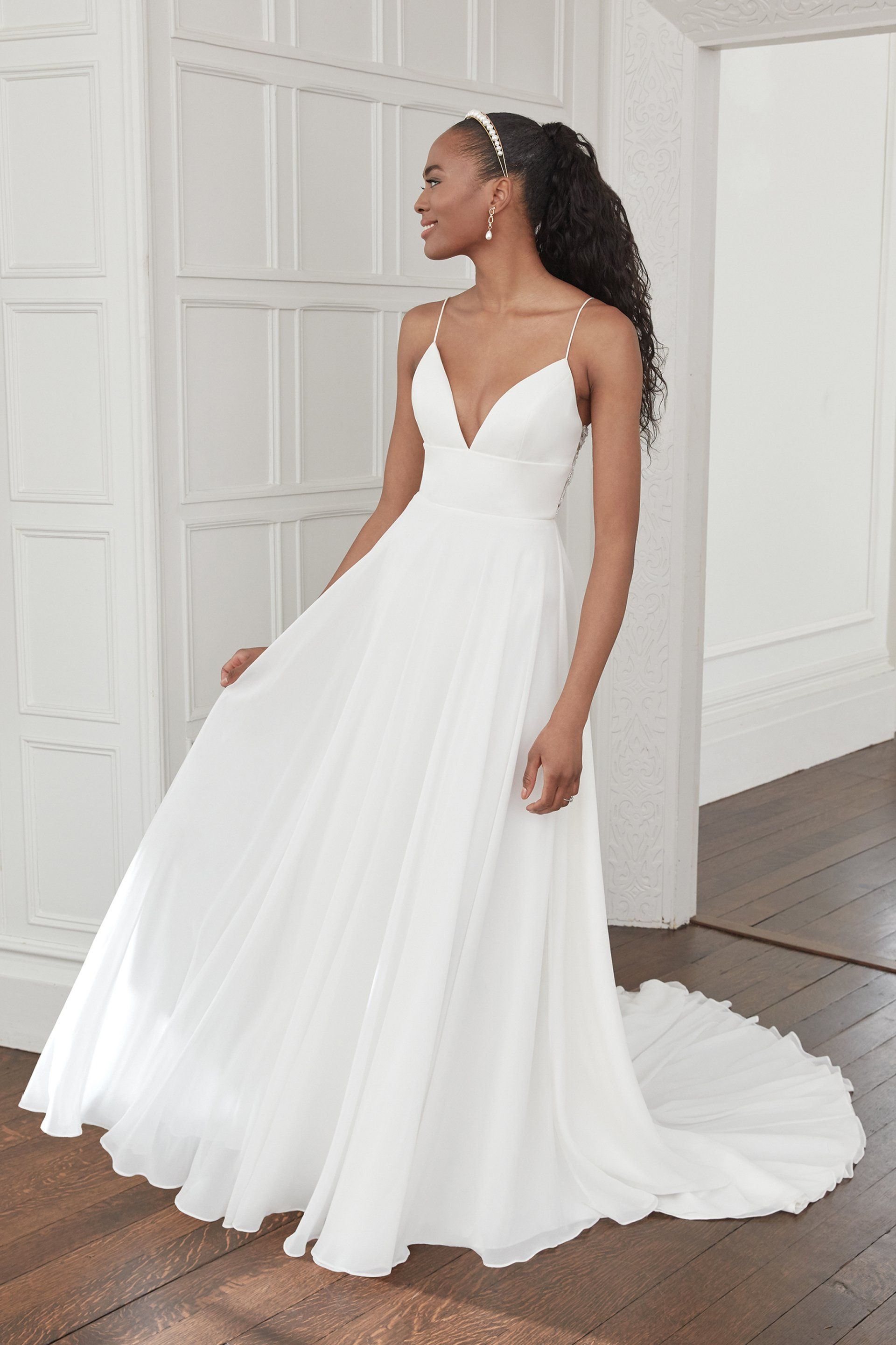 The light chiffon bishop sleeves add an unforgettable chic touch to this soft look. Clean and effortless, this flowy chiffon bridal gown features a modest V-neckline accented with flattering pleating across the front and back of the bodice. The light weight simple A-line skirt complete with a chapel length train will ensure you're attracting the right attention and are comfortable all day long.