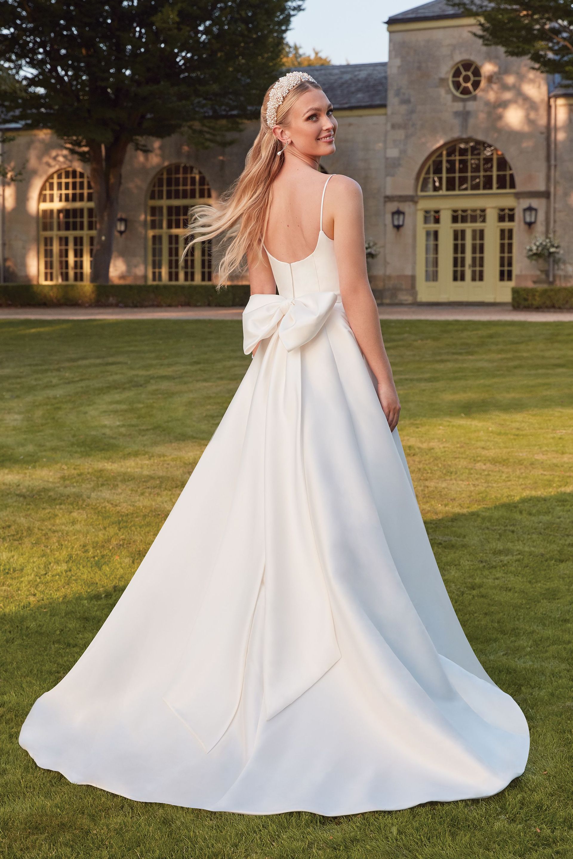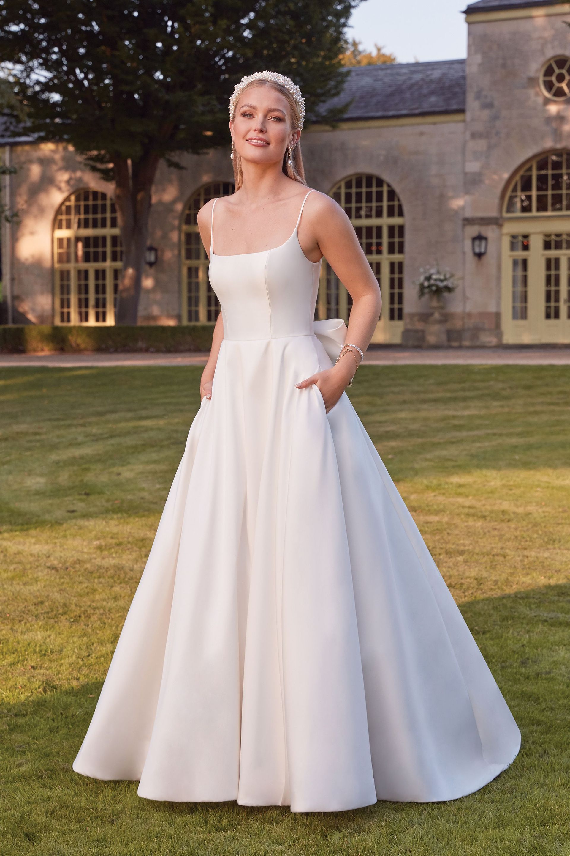 A contemporary interpretation on tradition, this Mikado A-line bridal gown showcases your sense of style in a timeless way. An on-trend square neckline is paired with delicate spaghetti straps creating a minimalistic yet soft look. The scoop back is accentuated with an eyecatching statement Mikado bow at the back waist that perfectly details the full skirt. Pockets and a chapel length train with a horsehair inside hem add the finishing touches. Simply chic!