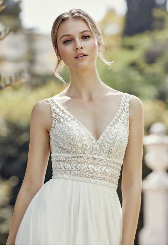Romance is defined in this Hollyood meets Art Deco A-line gown. Featuring Chantilly lace features under the iridescent beaded bodice with mirroring V neckline and V back. The exquisite beading continues on the cummerbund waist leading to the sofest of English net gathered organza skirt. The chapel length train finishes this romantic look. This style is also available with the bodice lined to the back.