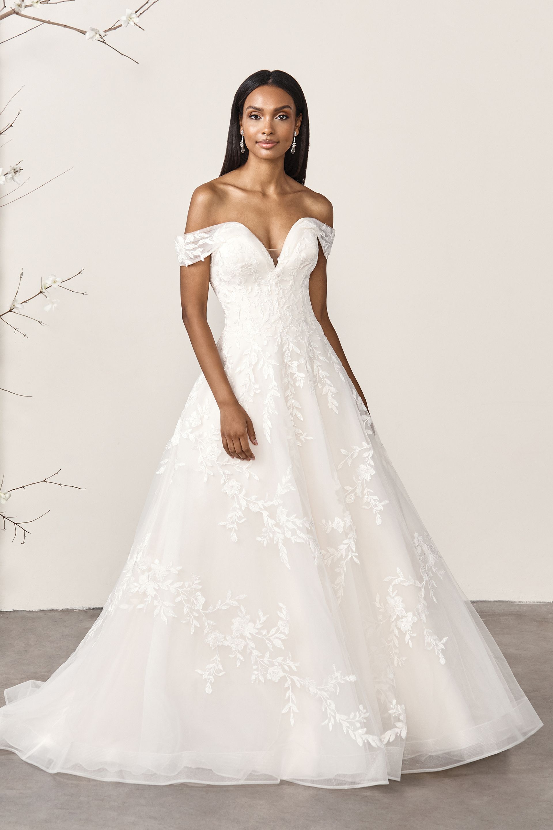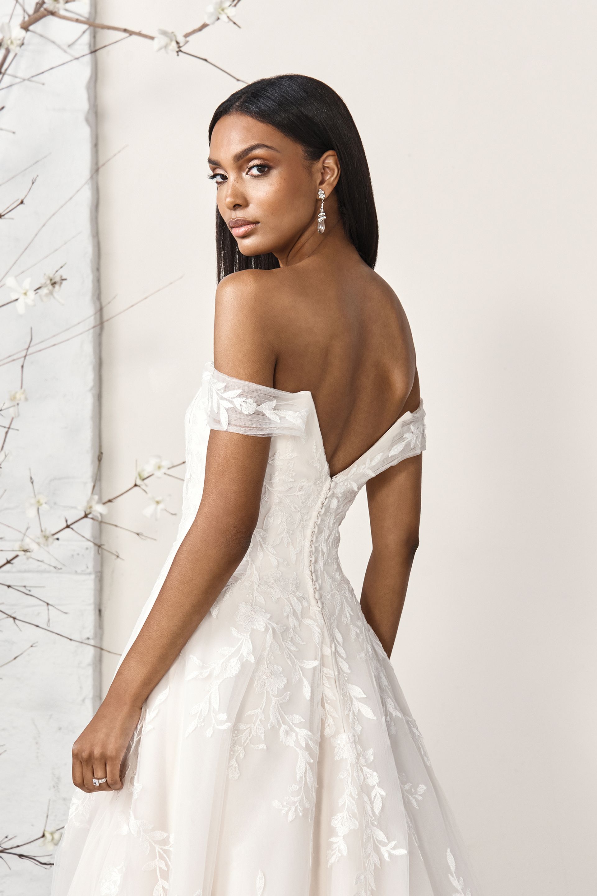 Charm your guests in this dropped waist tulle A-line bridal gown with an arresting off the shoulder portrait neckline. Adorned with sequined lace appliqués accented with pale blush thread that cascades down the skirt. Finished with a horsehair hem, a chapel length train, and romantic tulle covered buttons on the vivacious V-back bodice. Guaranteed to get the hankies out!