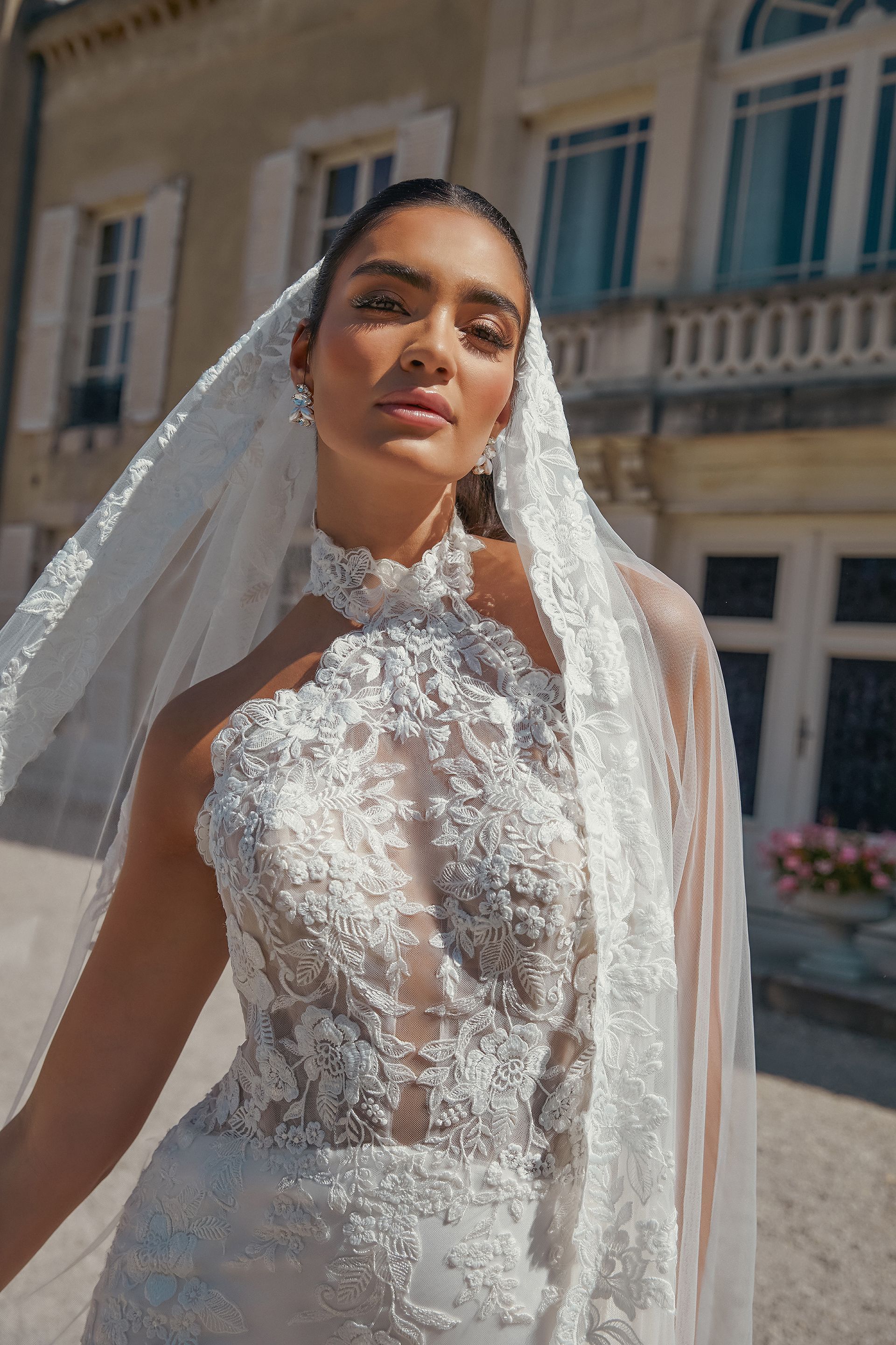 Embracing shape with sexiness and elegance - this trendy lace trumpet gown is perfection for brides looking to highlight their curves. Freshness flourishes with a plunging illusion Sabrina neckline and tantalising illusion V cut-outs in the side of the bodice. A soft Chantilly lace underlay is adorned with matte cotton lace appliques atop. Textured matte cotton lace straps lead to a low V-back. Finished with a horsehair hem and a chapel length train creating an impressive back statement, the couture-inspired touches retain utter romance.