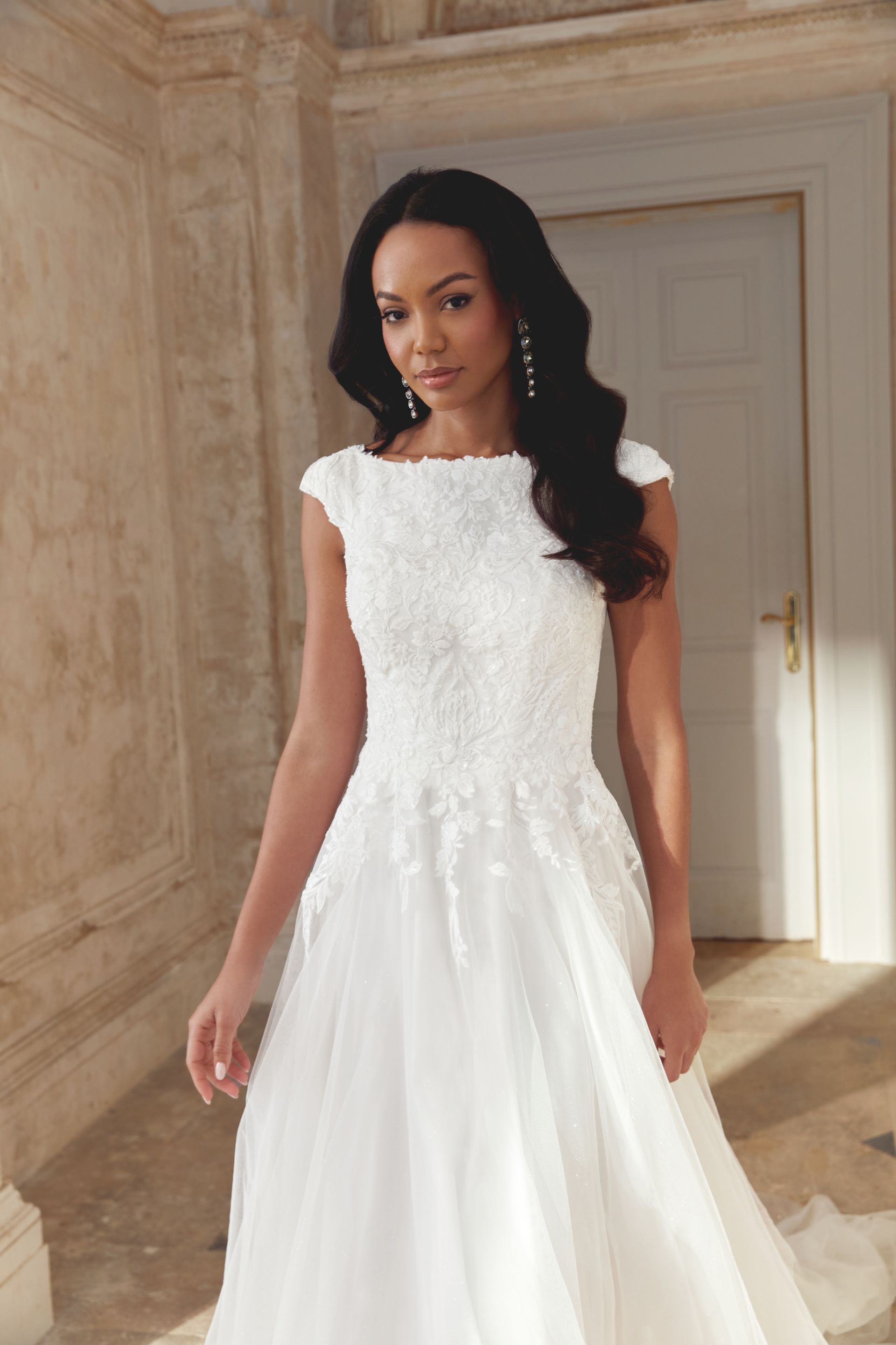 A vision of perfection for the bride with exquisite taste. Demure yet irresistibly alluring, this A-line gown embodies a seamless blend of timeless elegance and modern romance. The bateau neckline and gentle V-back frame the shoulders with understated grace. .A fully lined bodice, shimmers with sequins and tonal beaded lace appliqués, Softly capped sleeves and dainty covered buttons along the lace-covered back add an intimate, feminine charm. Layers of airy tulle float with every step, creating elegant movement that flows into a chapel-length train.