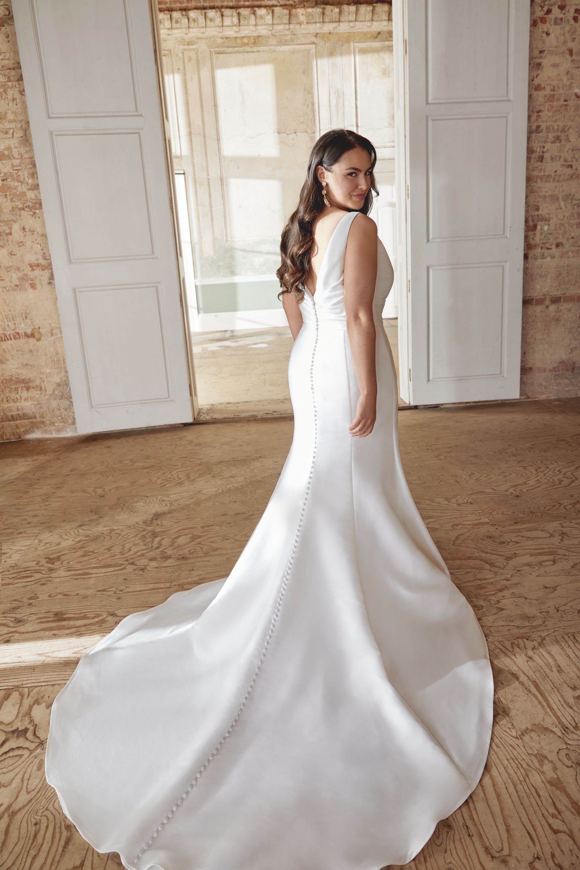 Aptly named, this sumptuous satin A-Line gown features an enchanting strapless scoop neckline with clever, detachable off- the- shoulder satin straps, Asymmetric waist enhancing pleating on the front of the bodice is met with stunning pearls and tonal beading taking this gown to a truly luxurious levell. Completing the romance, pockets and pretty pearl buttons cascade the entire back of the dress to the hemline of the chapel length train.